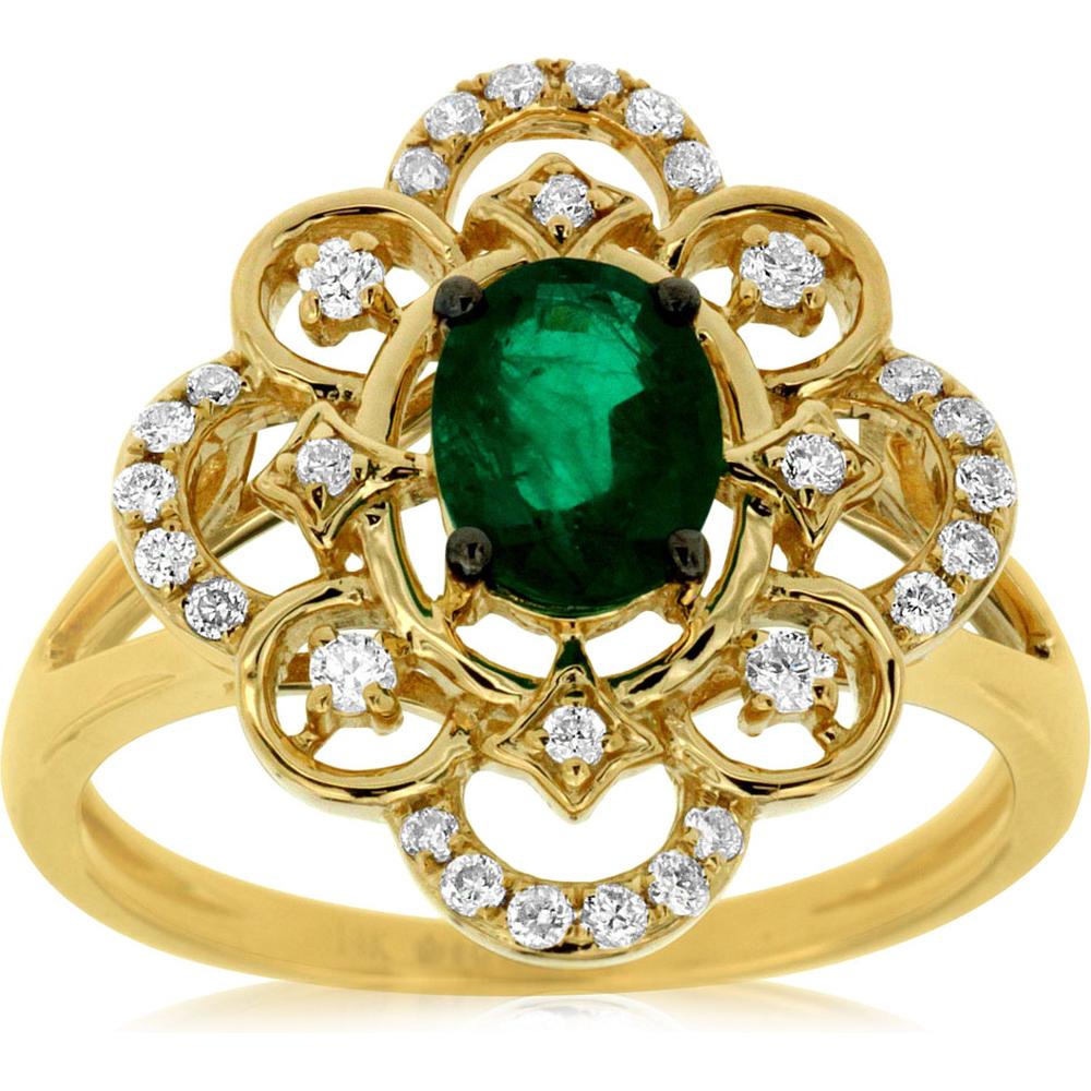 Royal 14K Yellow Gold Oval Emerald and Diamond Ring - 0.70 Carat Emerald, 0.22 Carat Diamond Total Weight