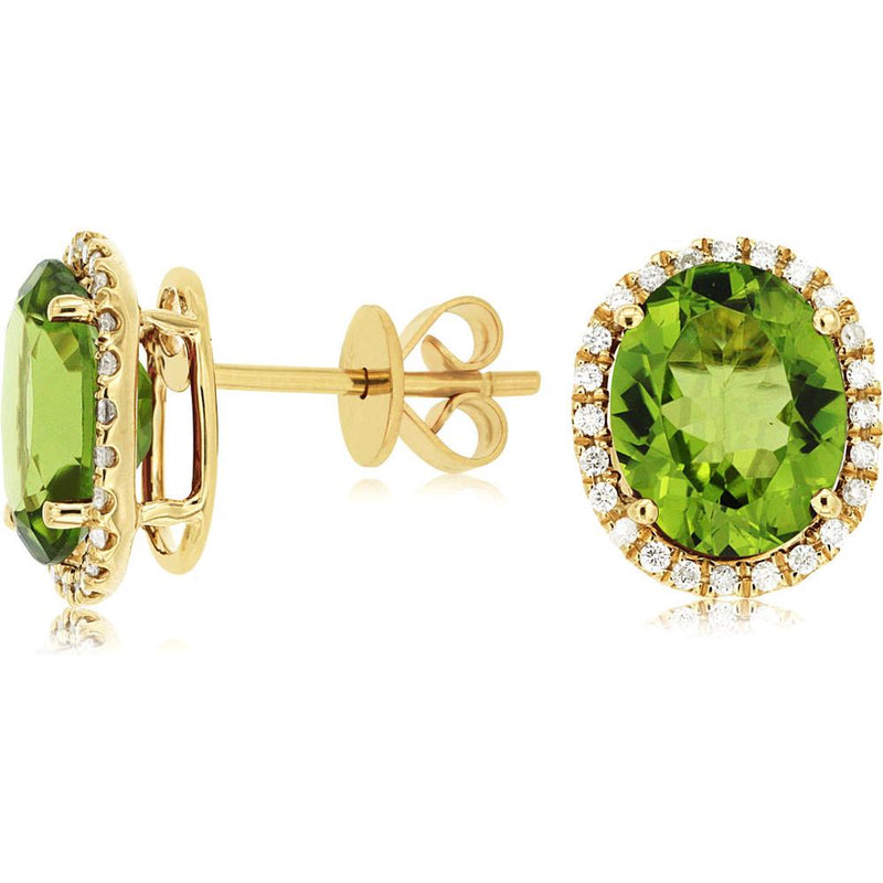 Decipher the diale carat of design in these 14K Yellow Gold Peridot & Diamond Earrings, where elegance meets effervescence in a harmonious dance of color and sparkle. Nestled within a radiant frame of gleaming yellow gold, a pair of resplendent oval-cut peridots captivate the senses with their vibrant green hue, totaling an impressive 5.40 carats. Like drops of sunlight captured in stone, these peridots exude warmth and vitality, casting a luminous glow that enchants all who behold them.