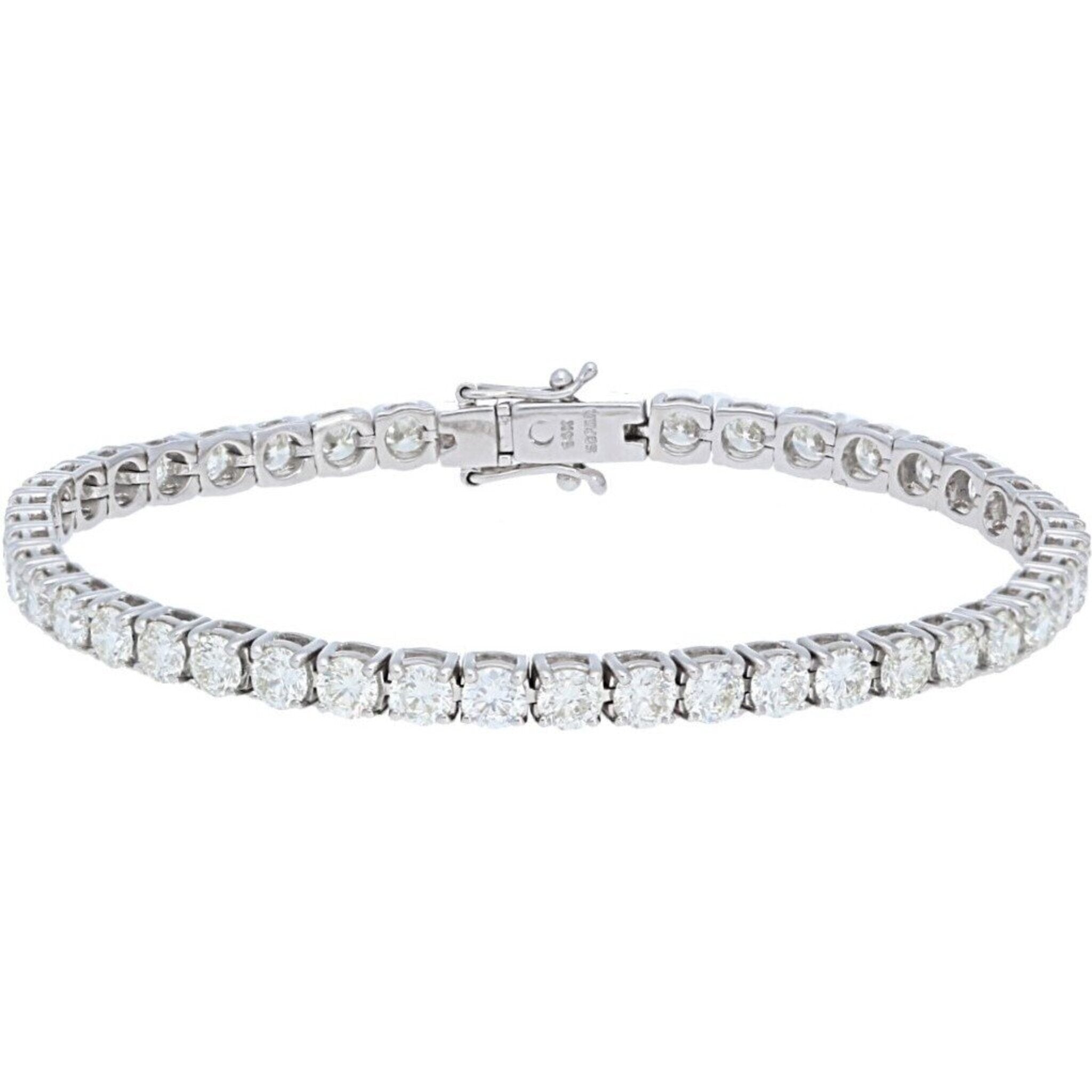 As you slip this bracelet onto your wrist, you'll find inspiration in the details of its creation. Each of the 53 round diamonds, totaling an impressive 7 carats, is meticulously set in a prong setting, allowing them to sparkle and shine with every movement. The diamonds boast a beautiful I-J color and SI2 clarity, ensuring that they catch the light in the most enchanting way.