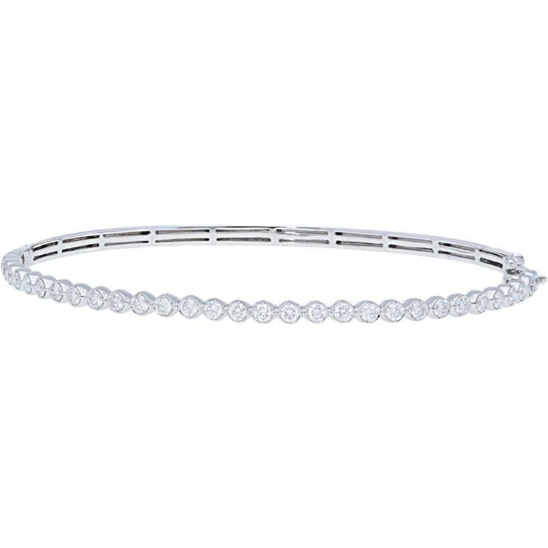 Indulge in the sheer elegance of the 1/2 Way Around Diamond Bezel Bangle in 14K White Gold. This exquisite piece of jewelry is not just a bracelet; it's a statement of your style, grace, and sophistication. Crafted with precision and love, this bangle boasts 14K white gold that glimmers like moonlight on a tranquil night.