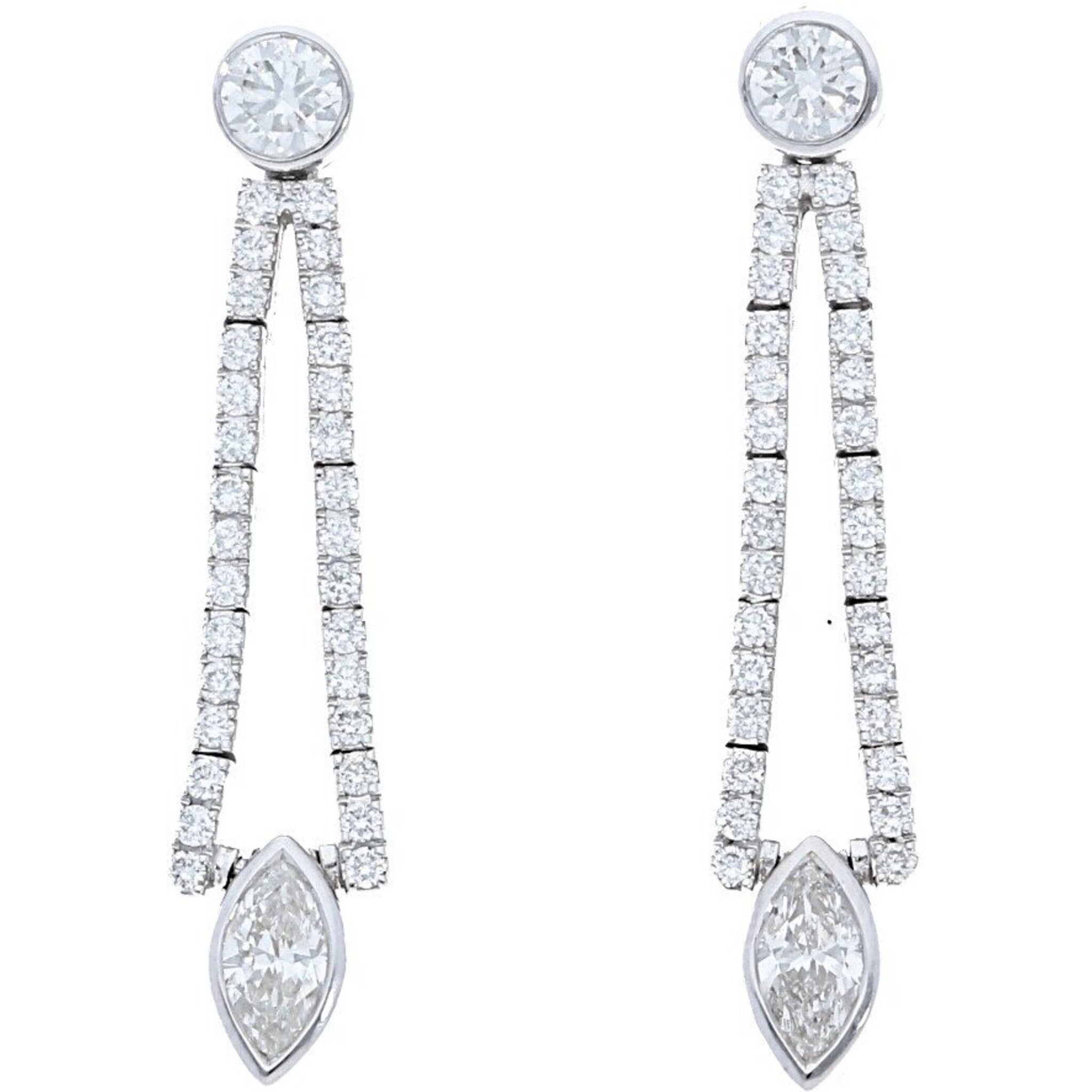The design of these earrings is a masterpiece crafted for the connoisseur. The marquise and round diamonds are set in a combination of prong and bezel settings, enhancing their beauty and providing a secure hold. With 64 dazzling diamond stones in total, these earrings are a true work of art.