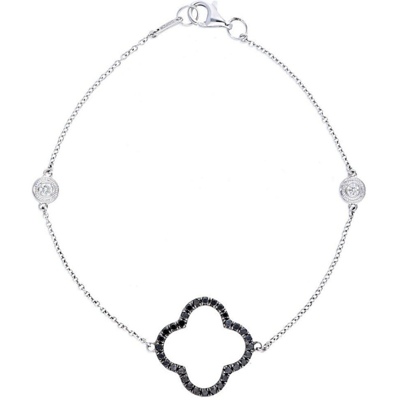 Imagine the allure of a delicate clover-shaped pendant adorned with 34 round black diamonds, each meticulously set in a prong and milgrain bezel setting. The contrast between the rich black diamonds and the shimmering 14K White Gold creates a captivating visual symphony that dances on your wrist.