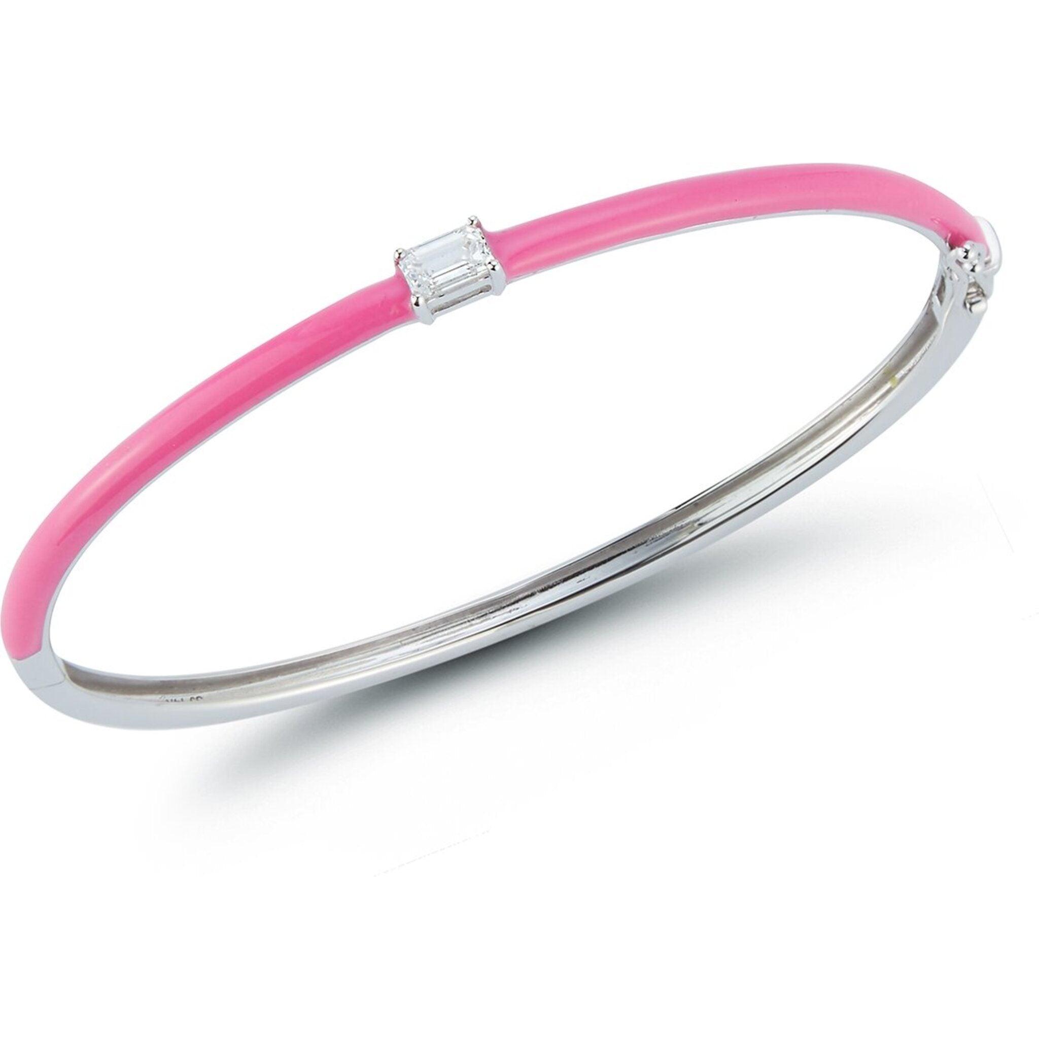 Dazzle in the epitome of elegance with our Pink Enamel Half Way Bangle, a true masterpiece from the renowned Sofer Jewelry collection. This bangle is not just jewelry; it's a statement of your unique style and sophistication. Picture yourself slipping this enchanting 14K White Gold bangle onto your wrist, and let the world marvel at your impeccable taste.